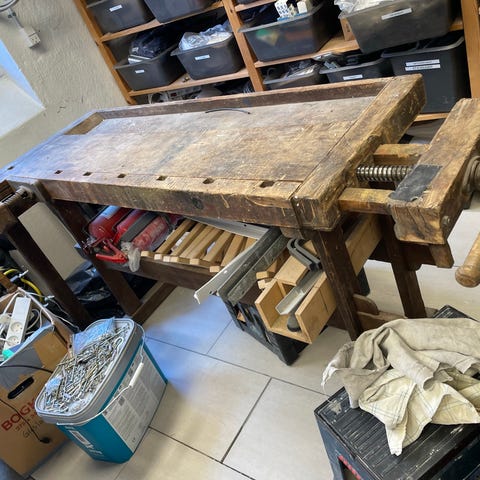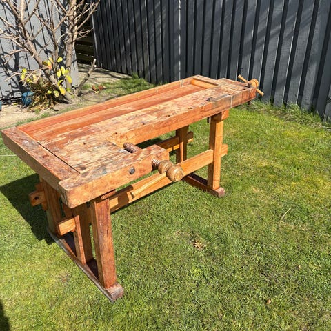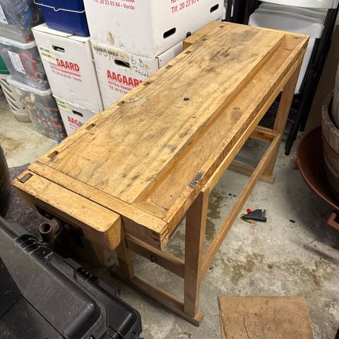 Høvlbænken står med brugsspor men er fuldt funktionsdygtig og ikke beskadiget. Der er ikke slør i for- og bagtang, men der mangler en vrider i bagtangen. Der medfølger 4 bænkdupper.