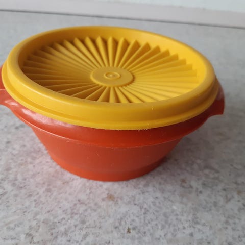 Tupperware form med låg i plast. Formen er riflet og egnet til fx desserter, gelé eller kolde retter. Leveres med matchende låg, som kan sættes på for opbevaring i køleskab eller transport. Farven er orange på formen og lys på låget. Velegnet til brug i køkkenet til servering og opbevaring.