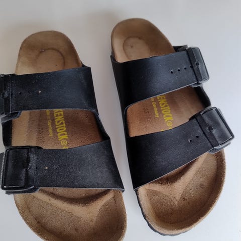 Birkenstock sandaler i størrelse 35. Modellen har én bred rem over foden med justerbart metalspænde. Overdelen fremstår i sort skind og sålen er formstøbt med korkmellemsål og sort ydersål i gummi. Velegnet som hverdagssandaler.