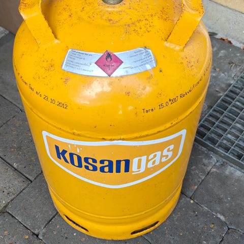 Kosan Gas gasflaske og regulator. Gul stålflaske med bærehåndtag i toppen. Velegnet til brug med gasapparater, der er kompatible med denne type gasflaske og regulator.