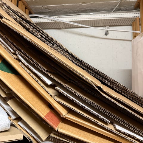 Flyttekasser i pap. Kasserne er sammenklappede og stablet, klar til brug til opbevaring eller flytning. Velegnet til pakning af forskellige typer indbo og genstande.