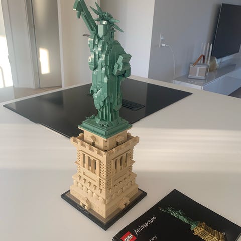 LEGO Architecture Frihedsgudinden byggesæt. Sættet forestiller Frihedsgudinden med sokkel og statue i typiske sandfarvede og grønne klodser. Egnet som byggeprojekt og udstillingsmodel for ældre børn, unge og voksne med interesse for arkitektur og kendte vartegn.