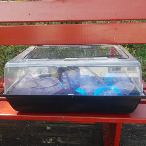 Fin bur i indhold i træ. Indeholder hus, trappe, hjul, vandflaske. Brugt til ét dværghamster.