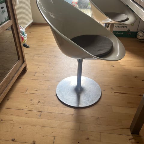 Kartell Masters stol i sort. Designet af Philippe Starck. 700 kr./stk. Stolen er udført i formstøbt plast med karakteristisk, skulpturel ryg, hvor tre ikoniske stolprofiler er flettet sammen. Velegnet som spisebordsstol eller ekstra stol i stue, køkken eller kontor. Kan bruges enkeltvis eller flere sammen omkring et bord.