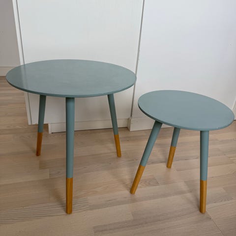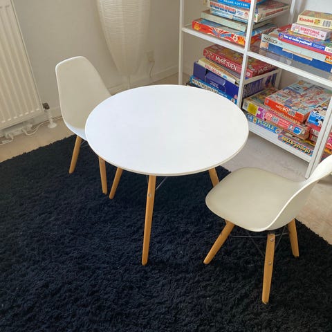 IKEA børnebord i rundt design. Bordet er udført i lyst træ i naturfarve med tre buede ben. Egnet som børnebord til leg, tegning eller andre aktiviteter i børneværelse eller opholdsrum. Bordet har en enkel og funktionel udformning, der passer ind i mange typer indretning.
