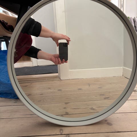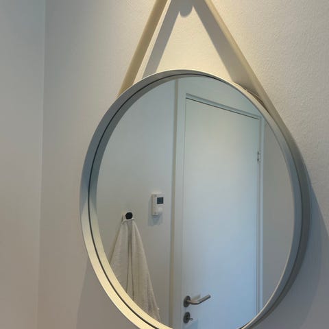 Hay rundt spejl med ramme. Spejlet har en cirkulær form med en enkel, lys ramme i metal-look. Det egner sig til ophæng i entré, soveværelse eller stue. På billederne ses også en tilhørende lys- eller gummiliste, som kan være en del af ophænget eller en kantbeskyttelse. Velegnet som vægspejl i hjemmet til daglig brug.