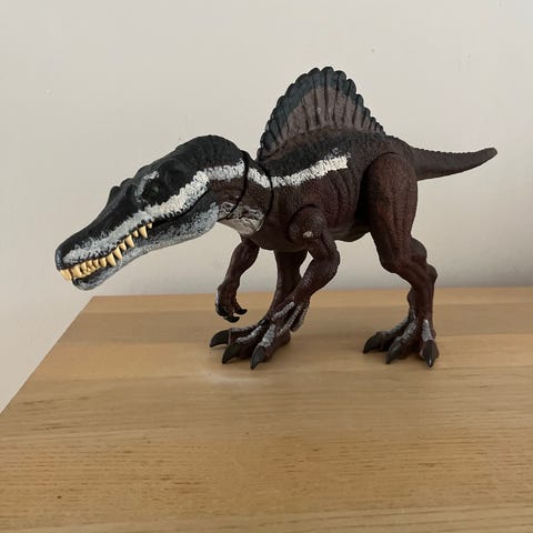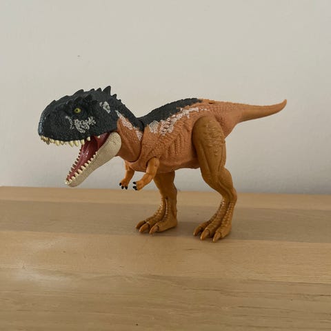Dinosaur figur med lange kløer og bevægelige ben, arme, hale, hals og kæbe.