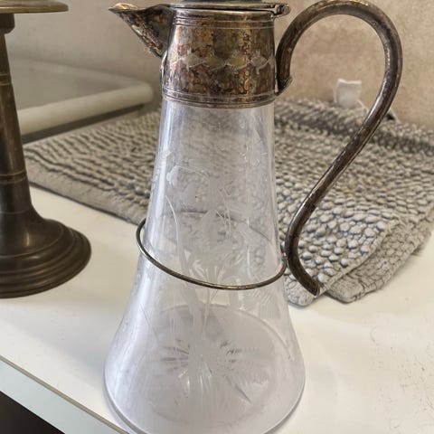 Vintage karaffel i glas med sølvplet låg og hank