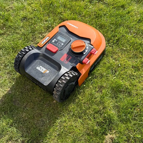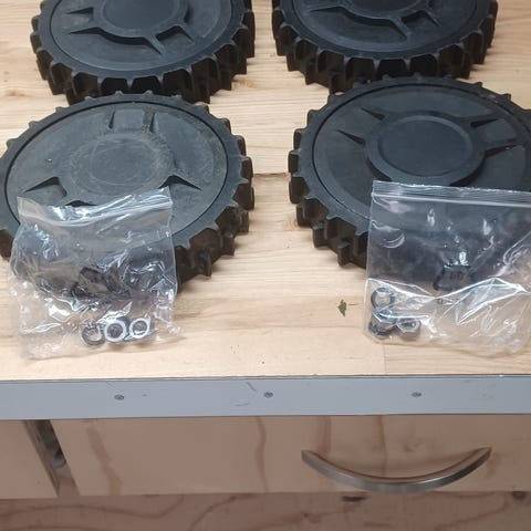 Off road hjul med v-slidbane, som det kendes fra et traktordæk. Det giver ekstra grip, og kan være en fordel i forhold til de almindelig hjul der medfølger, hvis du har en græsplæne med store huller eller en stejl skråning.