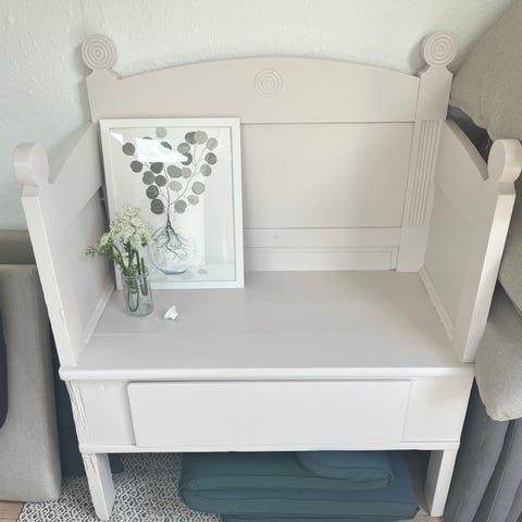 &Tradition bænk med opbevaring i træ med rødternet polstring på sæde og ryg. Bænken har ryglæn med udskårne detaljer og armlæn i massivt træ. Sædet kan løftes, så der er opbevaringsplads under siddefladen. Velegnet som siddeplads og opbevaringsmøbel i fx entré, køkken eller stue. Indersiden af ryggen fremstår med synlige slidspor på træ og flet.