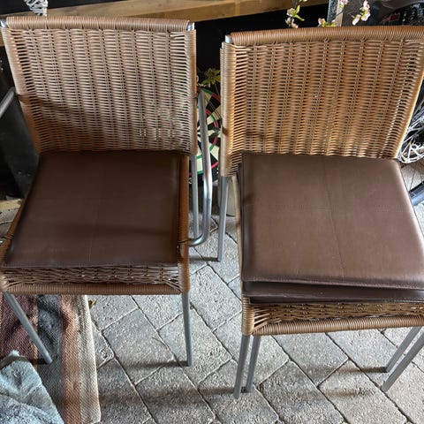 Spisestole med sædehynder. Den ene hynde er meget brugt, se billede. Resten er i fin stand.