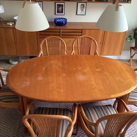 NY PRIS! Massiv bøg, lakeret, meget fin stand, med to tillægsplader a 50 cm. Der medfølger fem spisebordsstole. Kan ses og afhentes i Islands Brygge-kvarteret. Du skal selv være med til at skille bordet ad.
