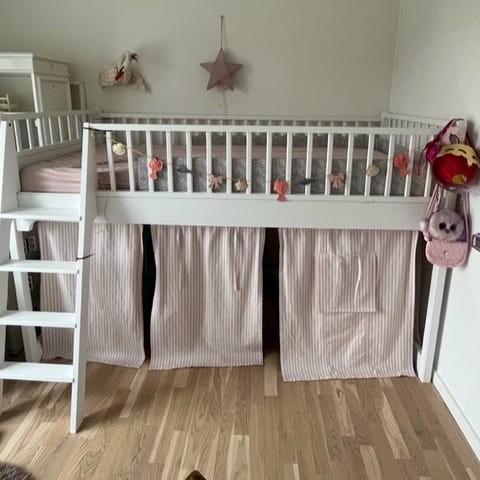 Hvid familie køjeseng med dobbeltseng i underkøjen. Sidste billede viser mål og nypris. Der er brugspor i form af et mærke i træet på det ene trin. Skal afhentes i Køge Nord