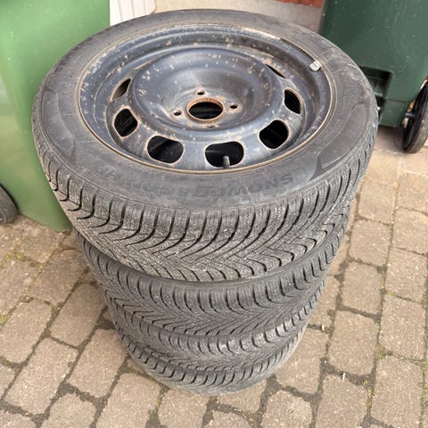 Fire Helårsdæk med 6 mm slidbane. Har siddet på en Opel Combo. Der er ikke så mange oplysninger på fælgene, så har taget screen shot fra T Hansen. 2 af fælgene har fået slag fra et hul i vejen.