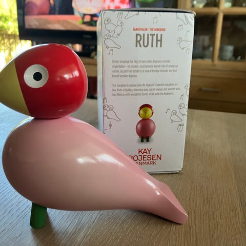 Kay Bojesen Sangfugl Ruth træfigur i lyserød og rød med gult næb. Leveres med stofpose og original æske.