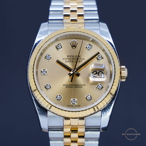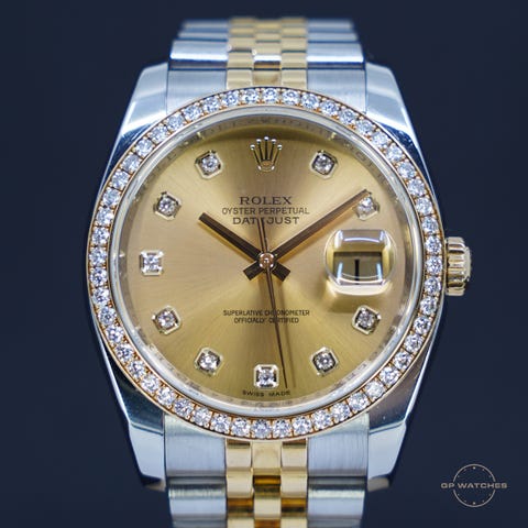 Rolex Datejust 116233. Det populære datejust i guldstål 36 mm med den skjulte lås. Denne model er med den smukke champagneskive med diamanter. Uret fremstår i flot stand og kommer med boks og papirer fra 2009.