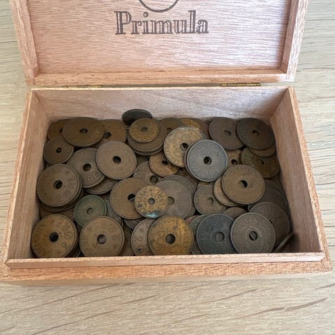En pose fuld af gamle 1 og 2 øre mønter. 350 g i alt. Fra 1950'erne.