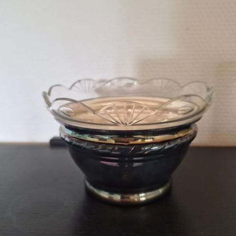 Glas skål på fod i klar glas. Skålen har slebet mønster i bunden og dekorativ kant. Foden er massiv med kugleformet dekoration rundt langs kanten. Velegnet som serveringsskål eller dekoration på bord eller reol.