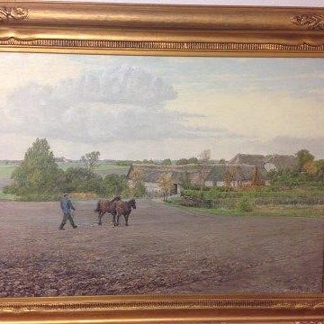 Oliemaleri, Ole Ring, motiv: Landskab, stil: Realisme, b: 91 h: 61, Stråtækt bondegård ved gadekær, landsbyen Smerup. Oktober 1957.