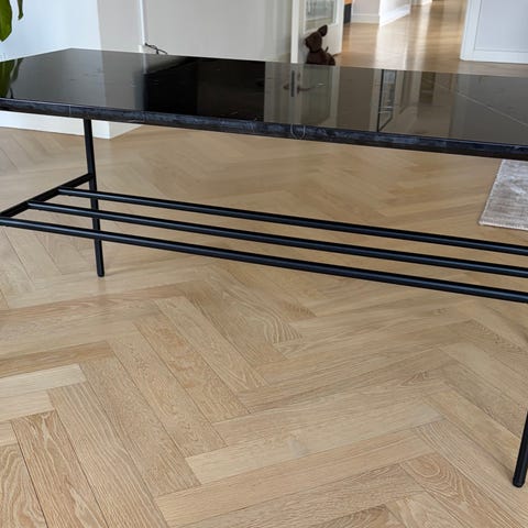 Rektangulært sofabord med bordplade i lyst marmorlook og stel i guldfarvet metal. Bordet har en åben ramme-konstruktion, som giver god benplads og et let, moderne udtryk. Velegnet som sofabord i stue eller opholdsrum med plads til bøger, dekoration og servering.