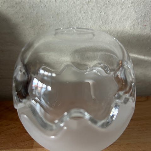 Holmegaard glas skål. Kugleformet design med bølget åbning og aftagelig topdel. Velegnet til snaks eller fyrfadslys. Diameter 11,5 cm