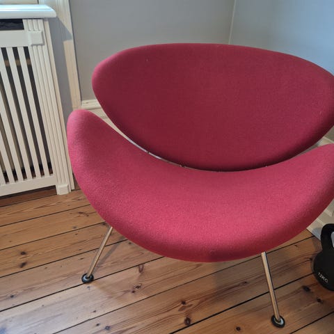 Stor lænestol, som man sidder fantastisk i. Den er næsten helt nypolstret. Den er dog en my for stor herhjemme til.