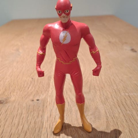 DC Comics The Flash actionfigur i rød og gul plast. Figuren forestiller superhelten The Flash i klassisk dragt med lyn-detaljer. Egnet som legetøj eller samlerfigur til børn og voksne, der kan lide superhelte og tegneserieuniverser.