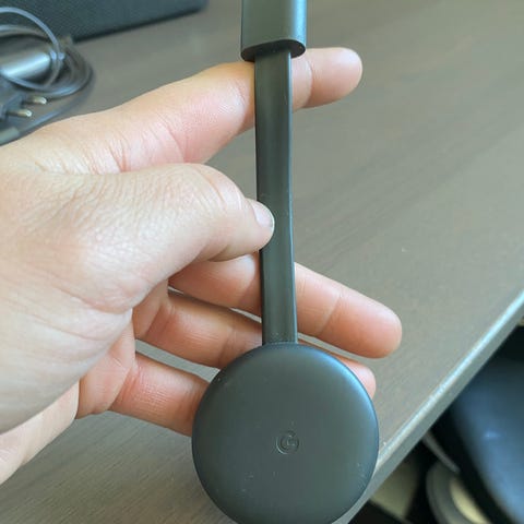 Google Chromecast streamingenhed med HDMI-tilslutning i sort. Enheden tilsluttes tv’et via HDMI-porten og får strøm via medfølgende strømadapter og USB-kabel. Chromecast bruges til at streame lyd og billede fra kompatible enheder som smartphone, tablet eller computer til tv-skærmen over hjemmenetværket. Velegnet til afspilning af indhold fra understøttede apps og tjenester på et tv med ledig HDMI-indgang.