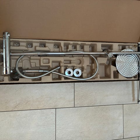 Hansgrohe brusesæt i krom. Sættet består af bruserstang, rund hovedbruser, håndbruser, termostatarmatur og vægbeslag/rosetter. Velegnet til montering i brusekabine eller bruseniche, hvor der ønskes både hovedbruser og håndbruser på stang.