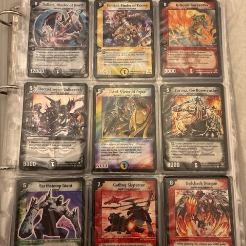 Blandet samling af Duel Masters kort, som jeg brugte til at tabe en masse kampe som barn. Nogle af dem, som Aqua Surfer, står højt fordi jeg har duplikater.