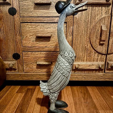 Dekorativ gåsefigur i grå og sort. Figuren forestiller en stående gås med detaljerede fjer og sko samt hat på hovedet, udført med detaljerede fjer og struktur.