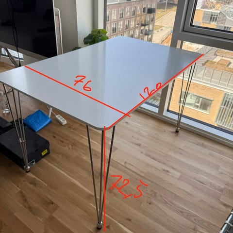 Hvidt spisebord i god stand, men med enkelte synlige mærker på overfladen. Skal bæres ned fra første sal