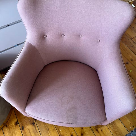 Brugt men i fin stand. Ej forsøgt at vaske betrækket på lænestolen. Afhentes senest I morgen lørdag.