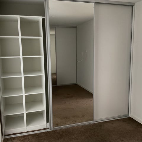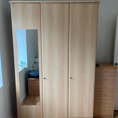 Kvalitetsskab med glaslåger og lys. Glidebure og bøjlestang. Nypris 25000