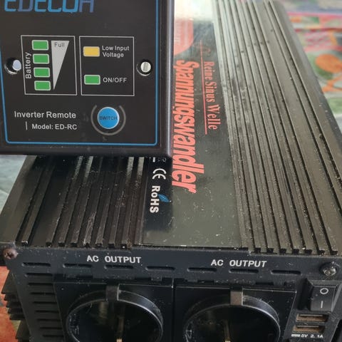 DC AC power inverter omformer med en effekt på 3000W. Enheden er udført i gul metal-kabinet med køleventilatorer i den ene ende og to 230V AC-udtag i den anden ende. Velegnet til at omforme jævnstrøm fra f.eks. batteri til 230V vekselstrøm til drift af elektrisk udstyr, hvor der er behov for høj effekt. Kan anvendes i sammenhænge som bil, båd, camping eller andre steder uden fast 230V netstrøm, hvor korrekt dimensionering og sikring er påkrævet.