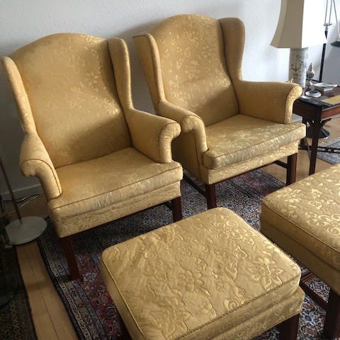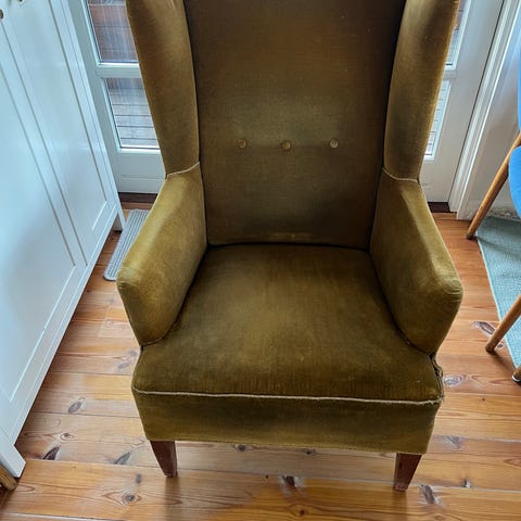To gamle øreklapstole med god siddekomfort. Fjedrene i sæderne er ok. Slidte, måske til ombetrækning. Kan hentes i Kalundborg