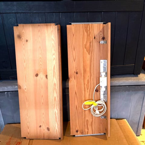 Én i koksgrå og én i lyst træ. Begge med 2x låger i lyssegrå.
