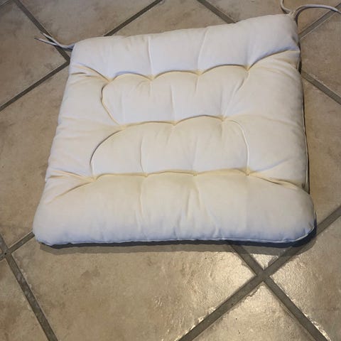 Hyndesæt bestående af 4 grå stolehynder. Hynderne er kvadratiske med quiltet syning og har snore i siderne til fastgørelse på stolene.