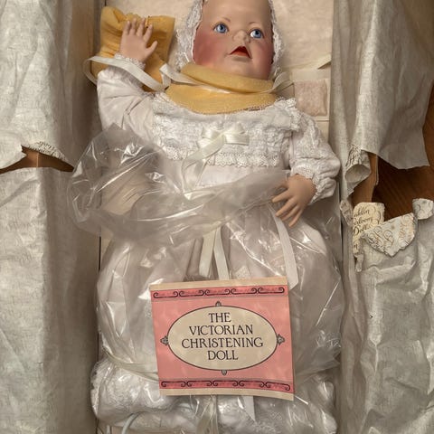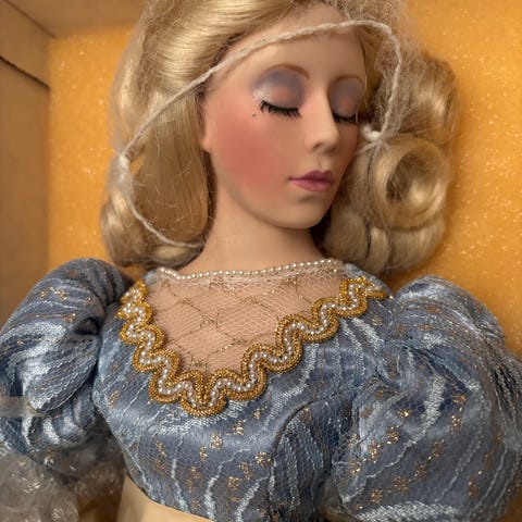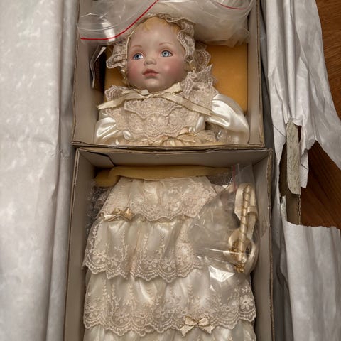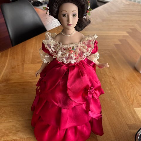 Smuk porcelæns dukke fra Franklin Heirloom med håndlavede glas-sko, forgyldt halskæde og en lille ægte diamant i tiara’en, som også er forgyldt.