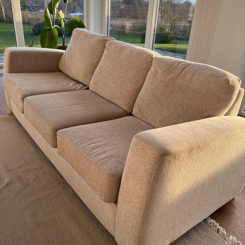 Lys beige sofa. Den er brugt, så den har nogle få brugsspor. Jeg sælger to, hvis man har interesse i det. Det er dun, der er inde i dem. 600 pr stk