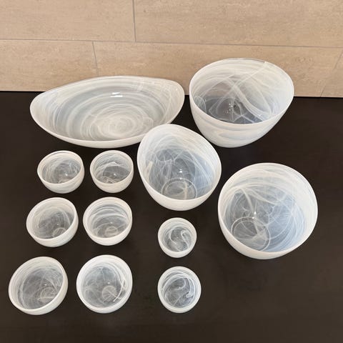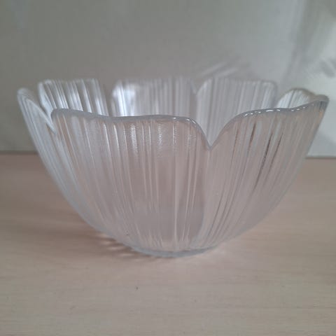 skålsæt i glas. Sættet består af en større og en mindre skål med bølget, struktureret overflade. Egnet til servering af fx salater, snacks eller til dekoration i hjemmet.