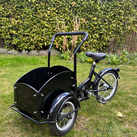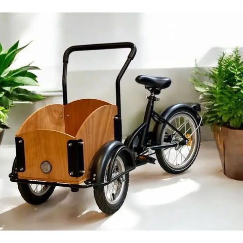 Lad børnecykel med 16" hjul. Cyklen er trehjulet med lad foran i trælook og stel i pink farve. Udstyret med saddel og styr i sort. Egnet til børn med mulighed for at transportere legetøj eller bagage i ladet. Designet som en mindre udgave af en klassisk ladcykel til børn.