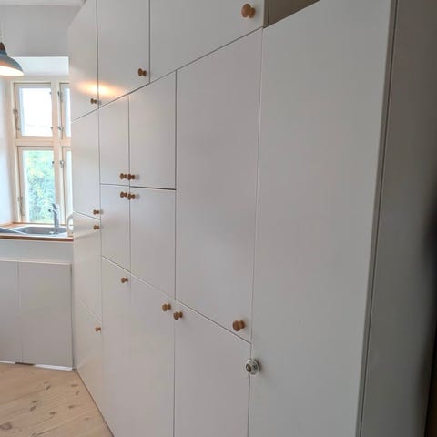 Skabet har været skruet sammen men er blevet skilt ad i to moduler så det er nemmere at få ned.