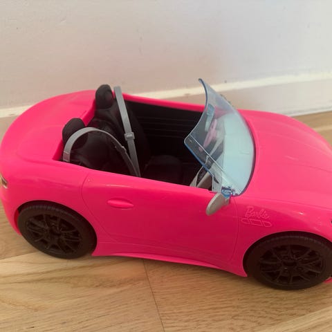 Barbie cabriolet bil i pink. Bilen er åben med to sæder, sikkerhedsseler, forrude, og detaljer. Egnet til brug sammen med Barbie-dukker. Fremstår rigtigt flot.