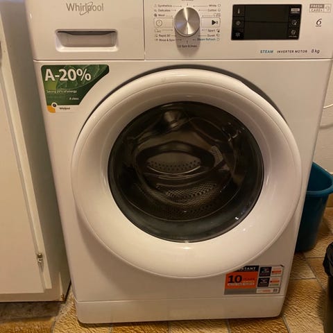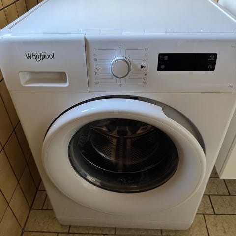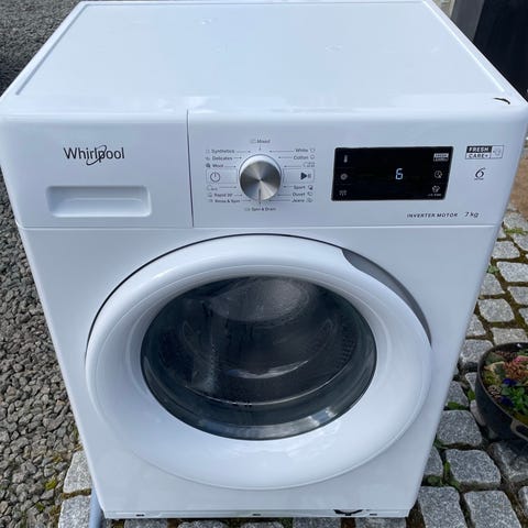 Whirlpool frontbetjent vaskemaskine i hvid. Maskinen har frontbetjent låge med stort rundt vindue og elektronisk betjeningspanel med drejeknap og knapper til programvalg og indstillinger. Tromlen er i rustfrit stål. Velegnet til almindelig tøjvask i husstande, hvor der ønskes en standard frontbetjent vaskemaskine med flere vaskeprogrammer.