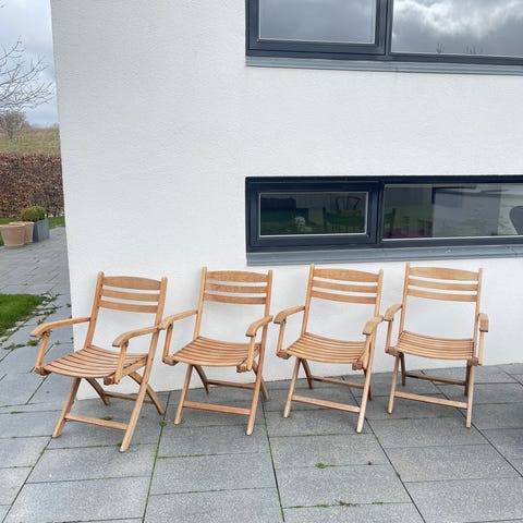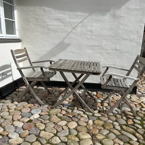 Flot Trip Trap (hedder idag Skagerak) havebord i hvidlakeret træ med 4 stole + hynder.