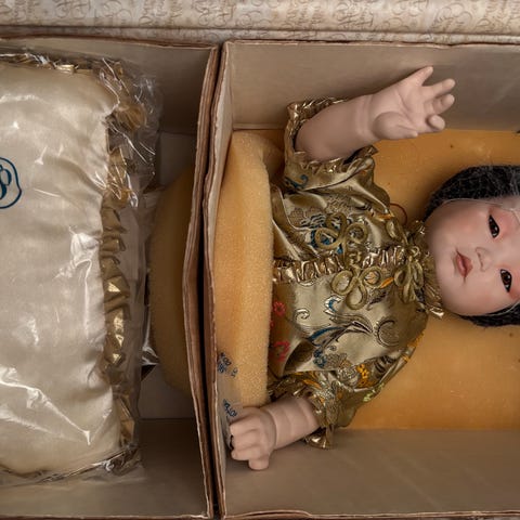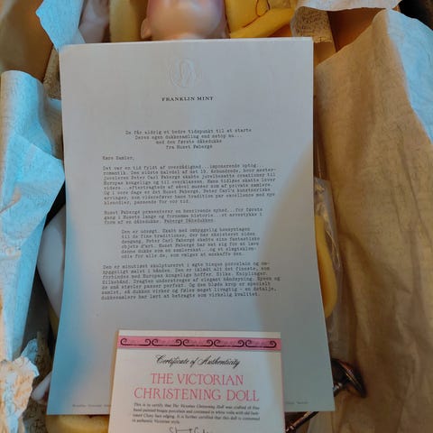 Franklin Heirloom Dolls The Victorian Christening Doll samlerdukke. Dukken forestiller et barn iført victoriansk inspireret dåbskjole i hvid med tilhørende kyse og tekstile tilbehør. Den leveres med certifikat, hvoraf det fremgår, at dukken er håndlavet og håndmalet. Dukken er velegnet som samlerobjekt eller dekoration.