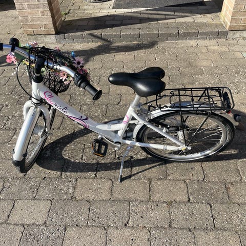 cykel til piger i alderen 6 – 10 år. Med lav indstigning, kurv foran og støtteben kombinerer den tryghed og funktionalitet. Hånd- og fodbremse sikrer sikker kørsel, inklusive hjelm og Lås .