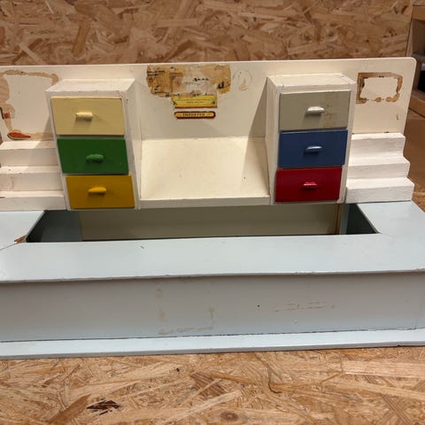 Miniature købmandsreol i træ