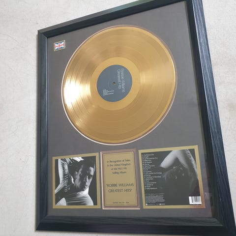 U2 The Unforgettable Fire platinplade. Indrammet præsentation med platinfarvet LP, CD og kassettebånd samt informationsplade og mini albumcover.